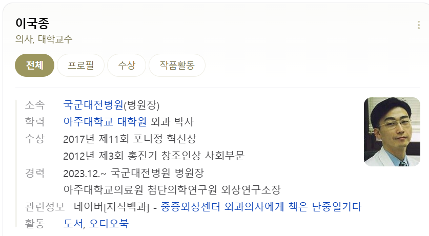 이국중 교수의 최근 근황은 지난 2023년 12월 27일 국방부장관의 임명으로 국군대전병원장으로 부임하여 현재까지 재직하고 계십니다.